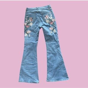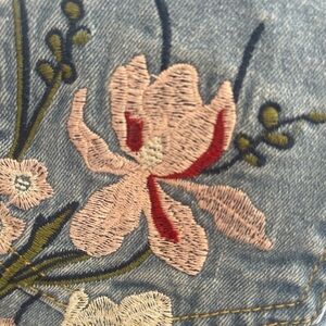 Stylish blue jeans featuring elegant floral embroidery. Perfect for adding a touch of flair to your wardrobe.