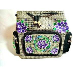 Embroidered Floral Backpack Small Zip Pockets Purple Flower Drawstring Gift NEW