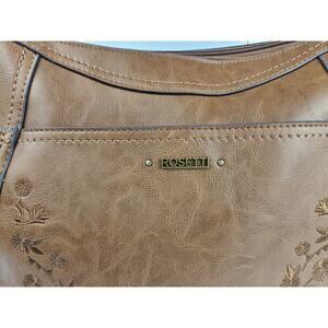 Brown Rosetti handbag embroidered with a great floral image to bring style to this highly functional bag. There are two zipper pockets, plus internal and external storage, perfect for phones and those other things we all tuck in our bag! Let this beauty help you stay organized on the go!