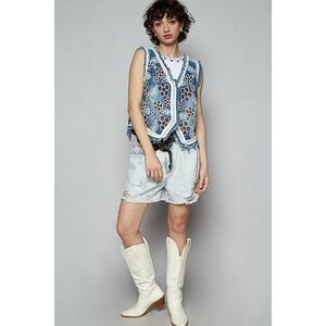 Embroidered Floral Frayed Hem Denim Vest - POL