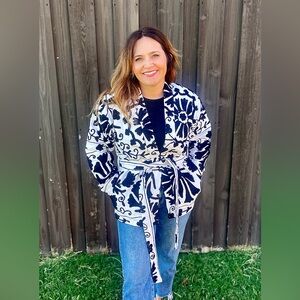 Embroidered jacket with tie front and side pockets. These are beautiful for work or casual wear.