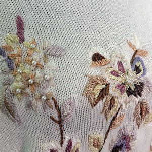 Ivory sweater with a mid-weight knit has embroidered flowers and branches in the colors of light pink, lavender, beige and brown - ALL down the front of the sweater! Intricate little pearls are woven into the embroidery.
