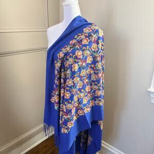 Embroidered Floral Royal Blue Shawl Wrap with Fringe Vibrant Boho Festival