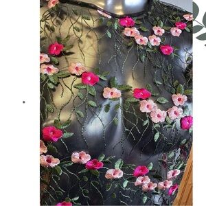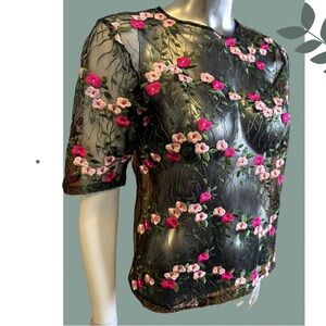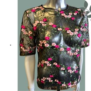 Embroidered Floral Sheer Short Sleeve Top Black Pink Green Size Small
