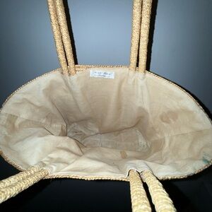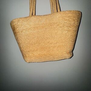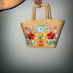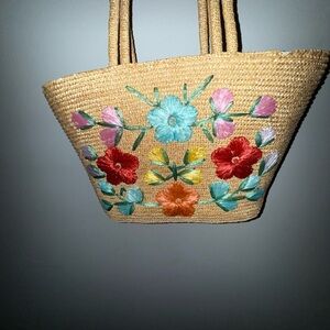 This stylish straw tote bag features vibrant floral embroidery, perfect for adding a pop of color to any outfit. The tan base is beautifully complemented by red, blue, and orange floral designs. Ideal for casual outings or beach days.