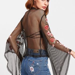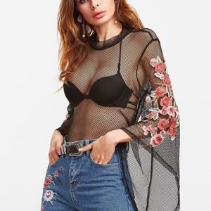 Embroidered Flower Fishnet Bell Sleeve Blouse