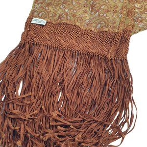 The Bolivia Embroidered Fringe Scarf is a stylish blend of rayon and polyester, boasting a beautiful paisley pattern. This tan and gold shawl wrap measures 72" x 8.5", providing ample coverage and versatility.