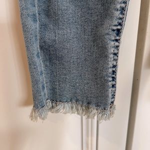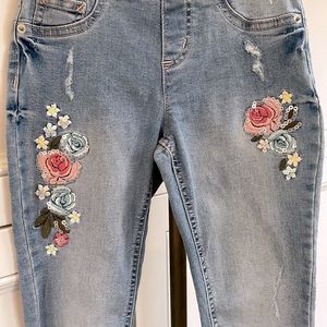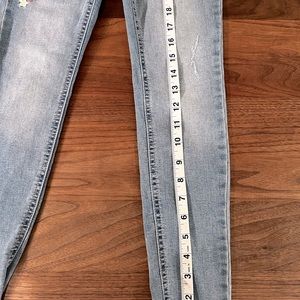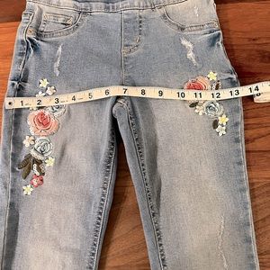 Light wash distressed girls jeans. Mid-Rise stretchy legging fit with Frayed ends. Easy Pull on. Worn once- excellent condition. Measurement and fabric instructions shown in photos