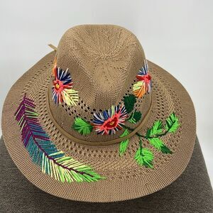 Good Used Condition. Crochet Hat with embroidered detailing. Very colorful. Large 3.5 Brim