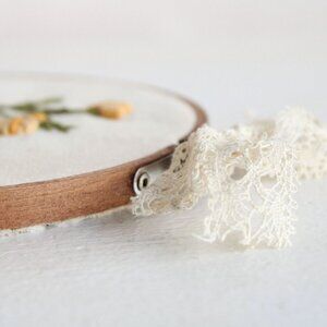 Hand embroidered Hoop Art of sweet dandelions. Stitched in vintage muslin fabric and framed in a wooden brown hand-stained hoop. Vintage ivory lace tied to the hinge completes the look and can be used to hang the hoop, as decoration or removed as you prefer. One of a kind. . Approx 6" in diameter. Due to the vintage nature of both the lace and the fabric, some variations in color and aging should be expected and adds to its charm.