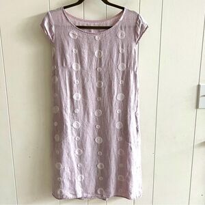 This beautiful linen shift dress has a pretty embroidered purple/mauve dot pattern on the front. It has cap sleeves and a round neck. The back of the dress has a ribbed panel detail. Team with sandals or pumps for that perfect summer outfit.