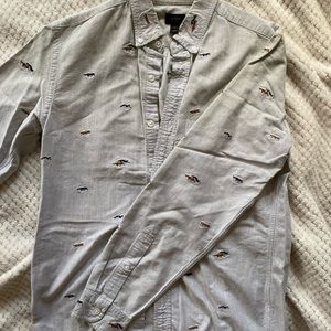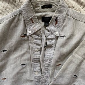 Embroidered with wolf dogs casual button down by J. Crew. Shirt has normal wear, no stains or rips. Slim fit.