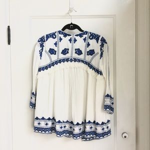 Lightweight, gauzy jacket / cardigan embroidered with a floral motif in shades of blue. Excellent condition. No size (no tags) but probably best for a small to medium (it's fairly free sized).
