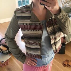 Absolutely amazing zip-up jacket with a woven front. Thick army green cotton fabric with cool details like an asymmetrical zipper and epaulets on the shoulders. Perfect condition, so cute. This is an XS but it’s not super tiny, I normally wear size 4.