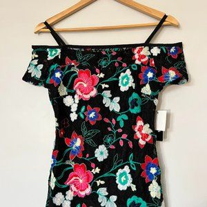 "Vibrant flowers are beautifully embroidered into the curve-hugging lace on this cold-shoulder sheath dress from GUESS.