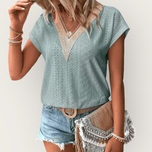 Seafoam Green Embroidered Lace V Neck Boho Eyelet Short Sleeve Shirt. Lightweight, stretchy top that adds a boho touch to any outfit! Can be dressy or casual. Size Medium, Large or XL. New with tags.