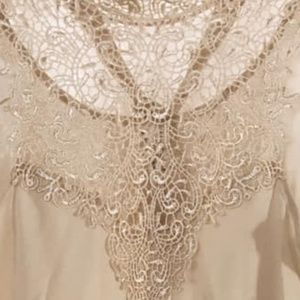 This stunning little number by Nella Fantasia has a vintage appeal, accented by an embroidered lace neckline and sheer tie in back. Its light and airy look styles its appearance. A "sheer" treasure for any wardrobe!
