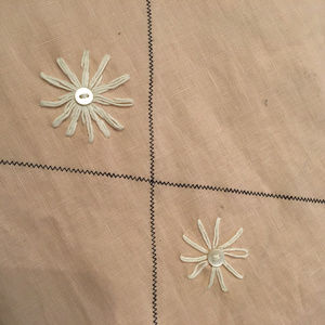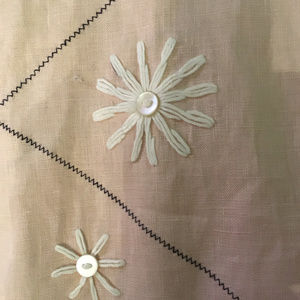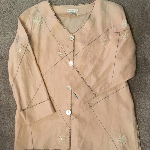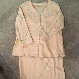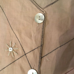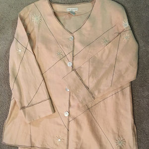 Peach linen jacket embroidered with white flowers centered with pearl buttons. It has larger pearl buttons closing the front and the sleeves are cuffed. Size M, bust 42", length 28" ( Matches Maxi skirt in this closet, skirt is a size S )