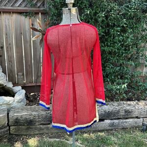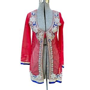 Embroidered Mesh Indian Ornate Embellished Red Sheer Long Top Sz XS - S / 30 EU