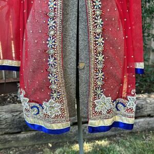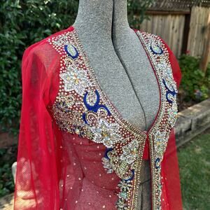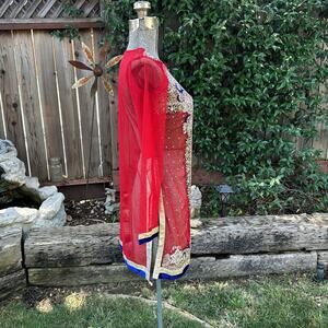 Embroidered Mesh Indian Ornate Embellished Red Sheer Long Top Sz XS - S / 30 EU. In good preowned condition. Very beautiful. Front is sewn together. you could add a button to make it easier. Size says 30 I'd say its a small to extra small see measurements for proper fit. Measurements are approximate taken flat.