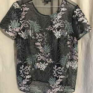 Beautiful embroidered top with pastel colors. Makes me think of a beautiful coral reef. Like new condition. Has soft shades of gray, pink and green.