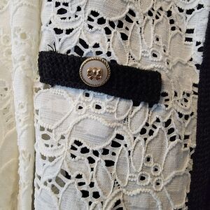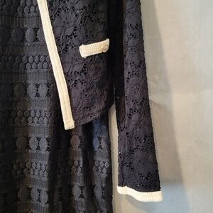 A pre-owned embroidered short sleeve midi black dress in women's small (S). It comes with two (2) open cardigens: a black cardigan with white trim and a white cardigan with black trim. The dress has a black lining. It is made in Korea.