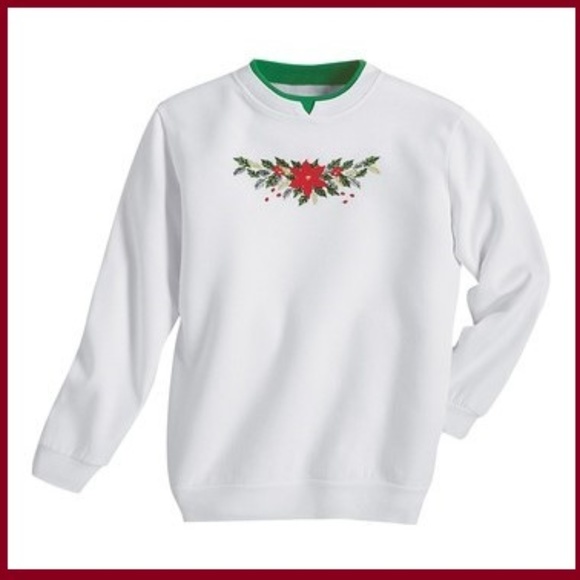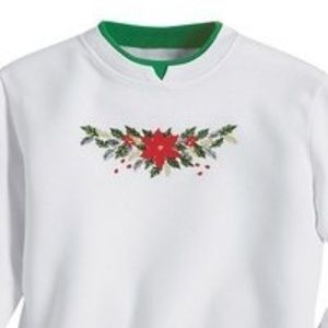Enjoy every minute of the festivities, dressed in these oh-so-soft sweatshirts of double-brushed fleece,each richly embroidered with a winter scene of poinsettias on white.A crew neck is notched for a peek of contrast color. Superbly styled with ribbed knit cuffs and hem. Cotton/polyester. Machine wash and dry. Imported.