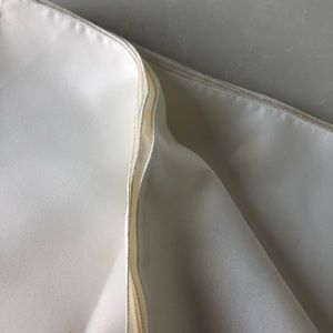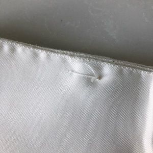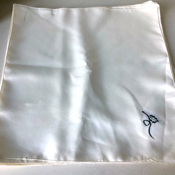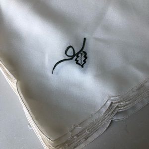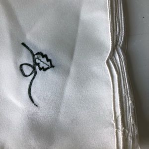 NWOT Pretty off white cloth napkins never used without tags with scalloped edging and leaf embroidery in dark green thread. Set of 12. Embroidery and scalloped edge in one corner. Finished seams on other 3 corners. Poly blend material. Stitched together when came from store and original stitch in place.