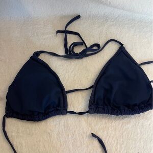 Navy bikini top with intricate pink and white embroidery. Perfect for a stylish beach day.