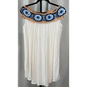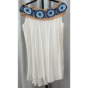 This elegant off-shoulder mini dress features intricate embroidery in gold and blue. Perfect for any occasion, it offers a chic and stylish look.