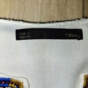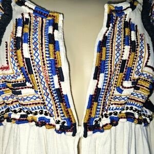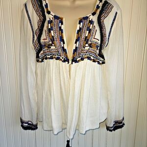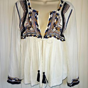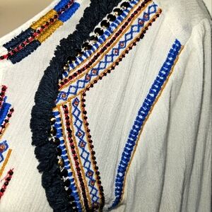 Embroidered, open front, tunic style top by Sfera. Pre-owned. Missing some beads on one side of the shirt in the front (see image).