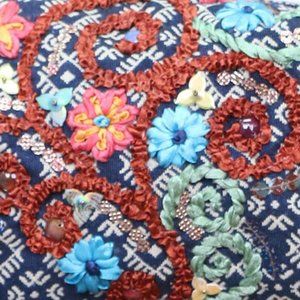 Ribbon embroidered jacquard origami make-up bag with tassel zipper pull detail.