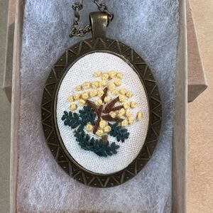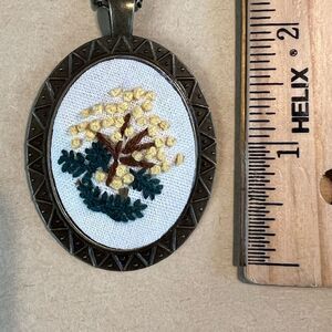 Beautiful oval pendant featuring an embroidered floral design. The pendant showcases yellow and green embroidery on a cream background, framed by a bronze-toned border on an 18” chain.