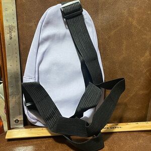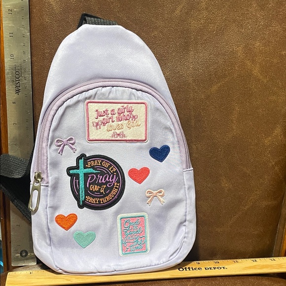 Stylish mini backpack with colorful embroidered patches. Features heart and bow designs.