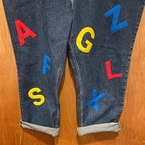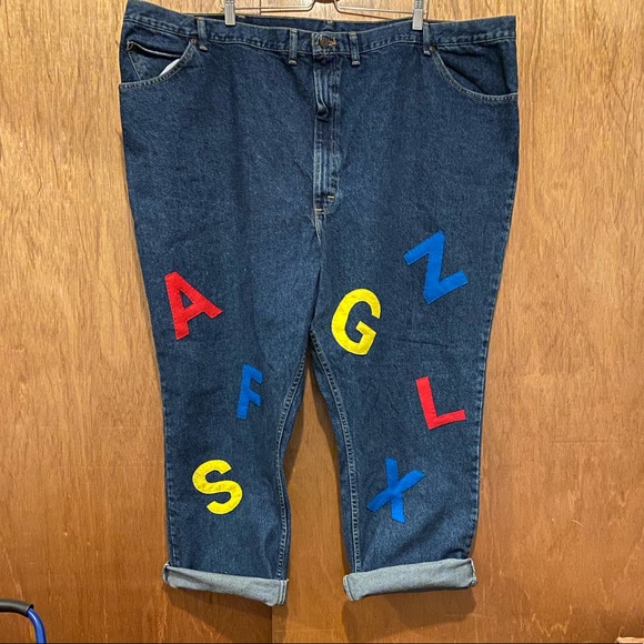 Plus size jeans customized with alphabet patchwork. I got a special order off an artist on Depop but unfortunately they are too big for me.