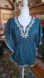 Gorgeous teal blue women's top with intricate embroidery and flutter wing sleeves. Perfect for casual or dressy occasions.