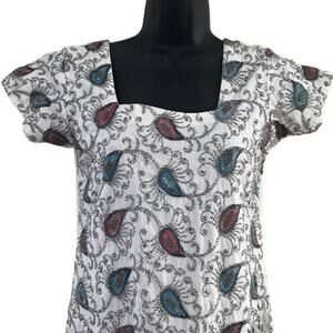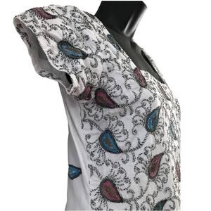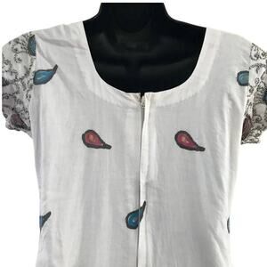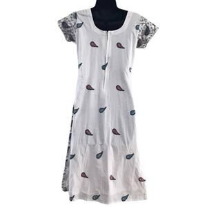 Embroidered Peacock Feather Dress, Paisley Print White Casual Summer Dress Small