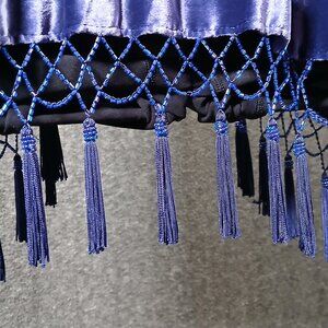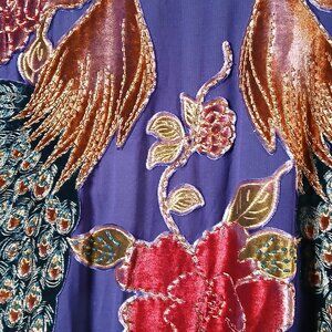 Striking statement jacket featuring richly embroidered peacocks and oversized florals on a sheer purple ground, layered with velvet appliqué and intricate beadwork. Designed in an open-front kimono silhouette, finished with dramatic beaded fringe along the hem and neckline for fluid movement and visual texture.