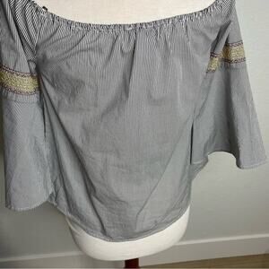 This embroidered peasant top with a very dark navy (maybe black) striped background to highlight the colorful embroidery. Can be worn off the shoulder. Beautifully embroidered bell sleeves. 100% Cotton. It is in good pre owned condition. See photos for approximate measurements.