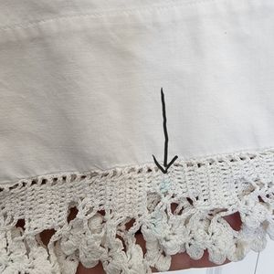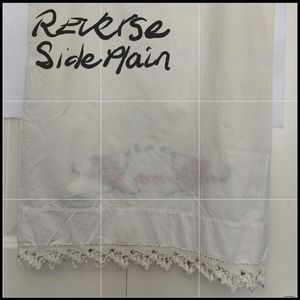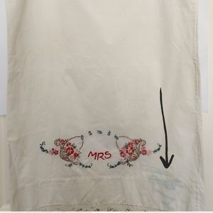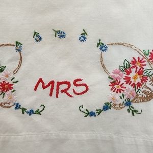 Embroidered Penny's Mrs. Pillowcase with lace edge 20.5 x 30.5 inches. Has blue stains as pictured. I soaked in oxi clean and rinsed before listing. No fiber content tag but feels like all cotton.