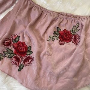 ✨ Embroidered Pink Roses Off Shoulder Satin Flowy Blouse Top Size M