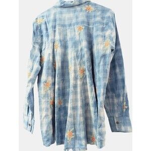 This button-down shirt features a relaxed, oversized cut in lightweight 100% cotton. Blue plaid fabric is accented with embroidered florals, a chest pocket, and a raw frayed hem for laid-back detail. New With Tags.
