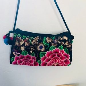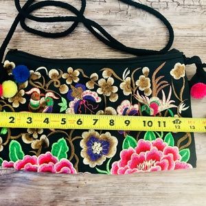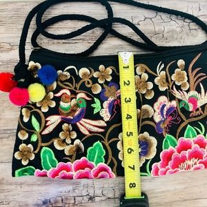 Embroidered Pom Poms Long Shoulder Bag/Crossbody Purse and Wristlet NWOT