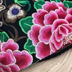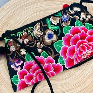 Brand new without tags. This cute pink and black purse is embroidered with flowers & had cut pom poms on each side. The smaller blue wristlet is included.