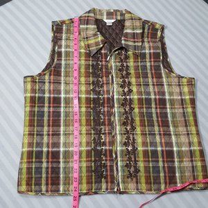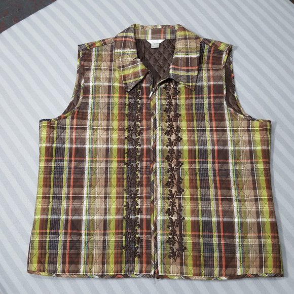 Slimming floral embroidered quilted zip-up vest in a woodland plaid from Christopher & Banks.