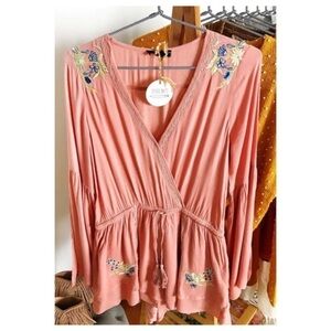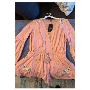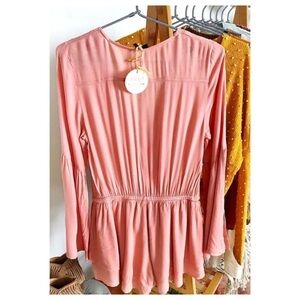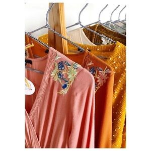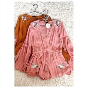 This pink/salmon colored romper features blue & light green embroidered bird & floral details in the upper shoulder & upper thigh of the shorts, a tie decal in front, stylish long flared bell sleeves & its lightweight made of 100% cotton. It is fully lined so it also is good for the upcoming Fall season with a pair of tights in a natural color to wear out on the town in case you get chilly 🥶