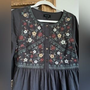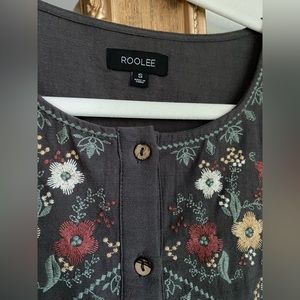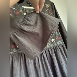 Beautifully embroidered Roolee Dress, like new. It has functional buttons, so nursing friendly. The buttons are a cute wood detail, as well as the fun bell sleeves that make this a really unique dress. 100% cotton, 35.5” from shoulder seam to hem