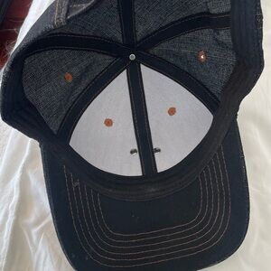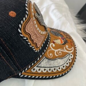Stylish cap with intricate rooster embroidery. Features black and brown tones with white accents.