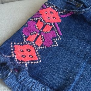 Jean shorts with colorful embroidered detail. Denim & embroidery in great condition, only worn 2-3 times max. Waist to hem on side: 9.5" inseam: 2"