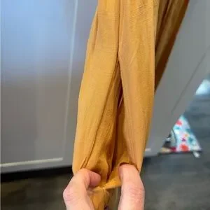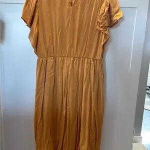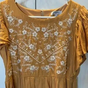 Beautiful mustard/rust dress with white floral embroidery. Features ruffled sleeves and a flowing design.